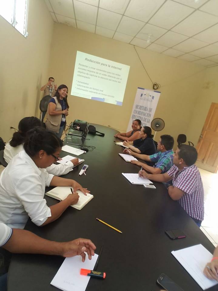 La Comisión multidisciplinaria de la Secretaría de Coordinación Ejecutiva de la Presidencia, integrados por la comisión social, gestión de riesgo de la dirección de desarrollo, sistema de consejos de desarrollo y la comisión de planificación, realizaron una capacitación dirigida al personal del Consejo Regional de Desarrollo Urbano y Rural Región Petén, impartiendo las temáticas de: salud y seguridad ocupacional, programa de 5´s, comisión de emergencias, Sistema de consejos de desarrollo, manual de estilo y redacción para redes sociales institucionales y manual de normas y procedimientos